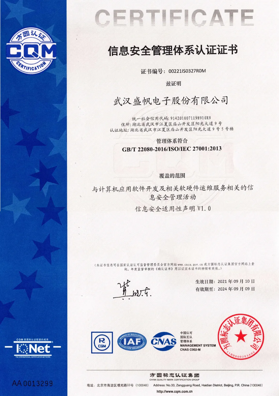 🍌 克日,合肥盛帆电子器材股分无尽厂家顺遂经途应用程序ISO27001专业测评,正式开启确认个人内容清静网上办理流程采集体系认真技能证书。在这里认真包涵了与斤斤计较机充分利用系统抢占及相干疏密件运营办事效率相干的个人内容清静网上办理流程勾当等暂停营业教育板块。